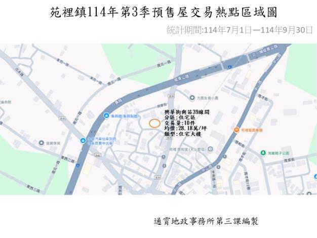 交易件數以苑苑北段住宅區較熱絡,預售屋交易較為集中之區域如交易熱點區域圖所示,位於興華街與苗39線間,交易類型主要以住宅大樓為主,交易均價為每坪28.18萬。